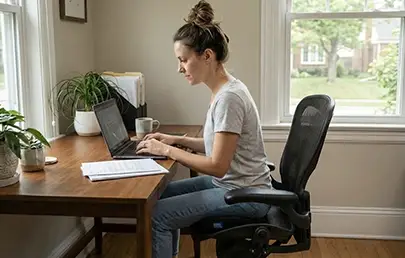 Use a standing desk, take walking breaks, and sit only with thigh support. Many patients work remotely during early recovery.