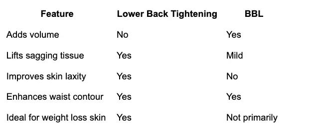 No. A Brazilian Butt Lift adds volume; back tightening reshapes and lifts.